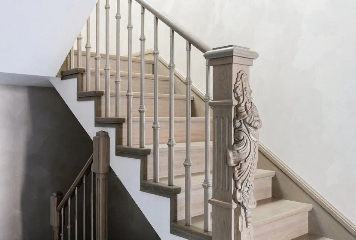 Главная роль в дизайне отведена гармоничному союзу материалов. Теплый, золотистый оттенок ступеней из бука создает ощущение уюта, в то время как перила из кованого металла добавляют композиции строгости и изысканности. Изящные декоративные узлы на балясинах подчеркивают тонкую ручную работу, а деликатный орнамент на подступенках вносит в дизайн нотку эксклюзивности и завершенности.